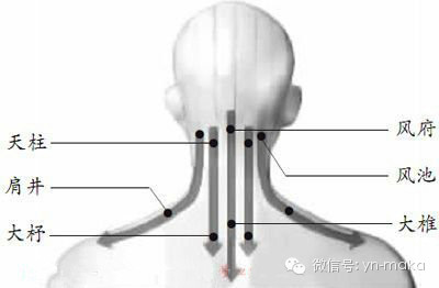 具体方法是:在颈后和肩膀均匀涂抹刮痧油,先刮拭第一条线,即从上向下正中督脉上的风府至大椎(如图);再刮拭膀胱经上的天柱至大杼,左右各一条;最后从风池穴刮至肩上的肩井穴,左右各一条,风池穴到颈根部从上向下刮,肩井穴从内向外刮。