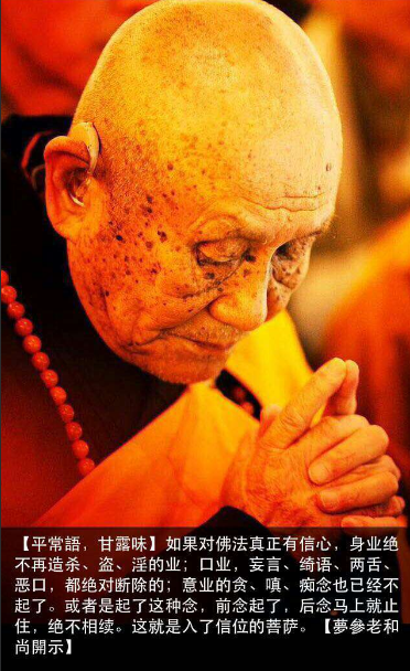 【平常语∙甘露味】我发现很多道友学佛只是好乐心,不是真有信心。你要不服气,现在我问你:你相信自己是阿弥陀佛,是文殊菩萨吗?如果没相信过,就没有信心。信心是相信自己是佛,信自己的心跟佛无二无别。同时看看自己的心里想什么、口里说什么、身体做什么?是不是佛所想、所说、所做?我们要细心思维、观察自己的心,使自心与佛心相应,产生信心。若过去没有信心,现在就发心。这就是所谓的发菩提心。发了菩提心,行的是菩萨道,即成就無上佛果。所以说,拜佛、拜观世音、地藏王、文殊、普贤菩萨,其实是拜自己本具的觉性。【夢參老和尚開示】