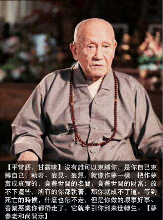 【平常語,甘露味】我们是什么业,什么因缘,就会遇到什么老师。学佛,我们常常会迷惑到底该走哪条路线?念佛好呢?还是参禅好呢?这位大师说念佛好,那位大师说持咒好。其实我们得选择适合我们自己的,选择我们学得愉快的、很有心得的方法,坚持这种方法不要放弃,不要听到别人的指正,我们就改变主意,坚持下去就好。【夢參老和尚開示】