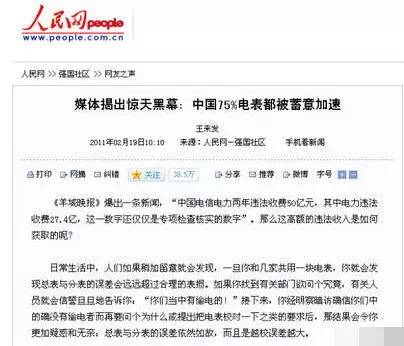 21日,中国官方媒体《人民网》转载了一篇报道,文章指出,中国75%电表都被蓄意加速。该报道写到,对家庭正在使用的电表检测的结果更令人感到吃惊:偏差最大的要快28%,大多数快105左右,也就是说居民要无端地多掏10%-28%的电费。