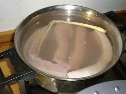 找一口大锅,装满冷水。将生的猪肉略沖洗后放入,置于炉上。开火,要将火开到最小最小,直到再小就熄灭那么小,然后等半个钟头(时间视锅的大小而定,原则是火要小,水不能冒汽)。半小时后,会发现整锅水泛红(血水),上面浮着一层杂质(淋巴),闻起来奇臭无比。但是肉还是生的,水仅是温的。将水倒掉,用温水沖洗并搓揉一下猪肉,这样的猪肉才算去腥。葱姜酒在料理中应该是用少量来增香用的;大量的用来压味,君臣之道就乱了。