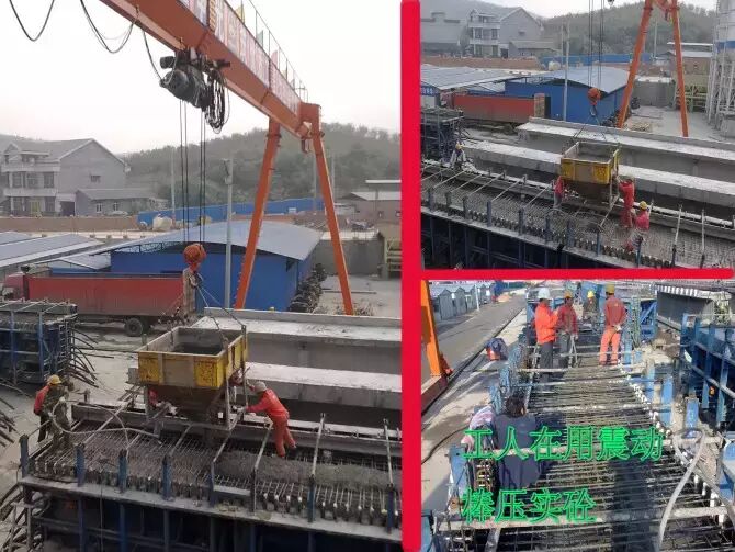 17.封端。压浆结束后须在24小时内封端。第一副图为工人在装模板,第二副为工人在浇筑混凝土。第三副图为模板拆除后工人在抹平