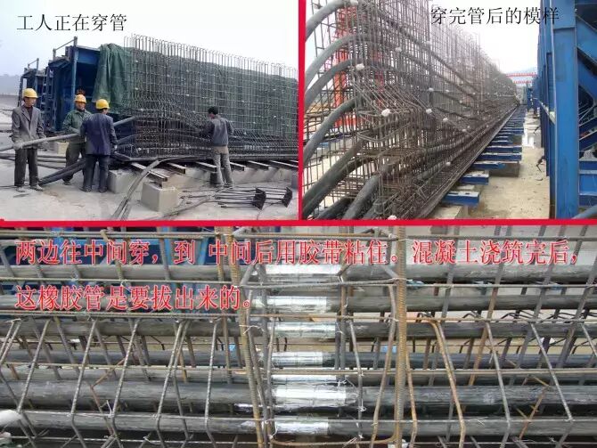 4.穿管。每个孔道由两段橡胶管接成。中间设一个接头。等混凝土浇筑完毕后,这橡胶管是要拔出来的,拔管时从梁的两端反方向拔出。