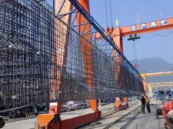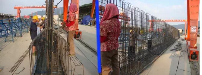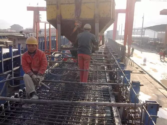 3.吊底腹板钢筋。用两台12.5吨的龙门吊将其吊入制梁台座。然后调整、补充钢筋。装预埋件。最后通知监理检查,合格后穿橡胶管。请仔细看看下图,梁体上有很多白色的小点。那是混凝土垫块。作用是保证钢筋与模板间留有空隙,也就是形成保护层。垫块以每平方米不少于四个布置。