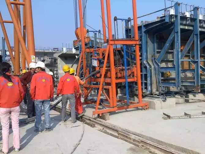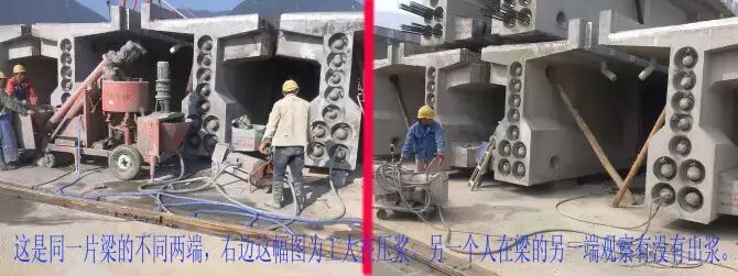 15.压浆。张拉完毕后,为防止钢绞线腐蚀和预应力损失,须在48小时内进行灌浆。压浆顺序为先下后上。即先压下面的管道,再压上面的管道。同一管道压浆连续进行,一次完成。记录好压浆时间,环境温度,浆的温度,浆的流动度,真空度等。