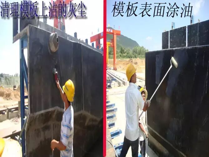 5.安装模板。模板安装之前须清洗干净并涂脱模剂。注意底模与端模、侧模均应垂直。连接处要紧密不漏浆。