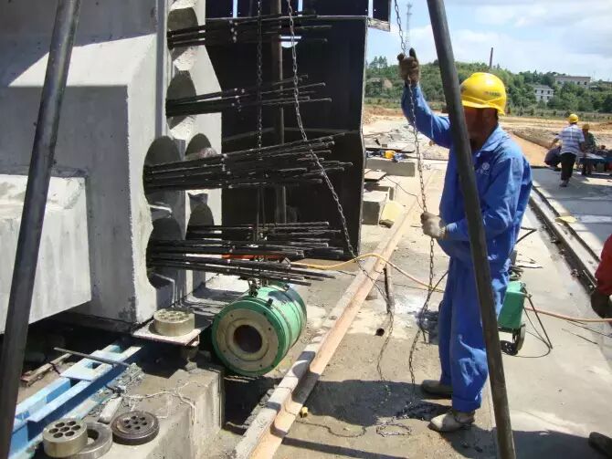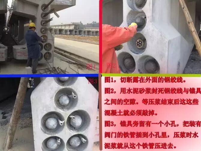 14.压浆前的准备。张拉结束后,伸在梁外面的有75mm长的钢绞线就已经没有作用了,需要在张拉完毕后24小时内切除。切断处距离工作夹片外30~40mm。压浆时两端都必须是密闭的,所以必须在桥梁两端用水泥砂浆封住钢绞线与锚具之间的空隙。