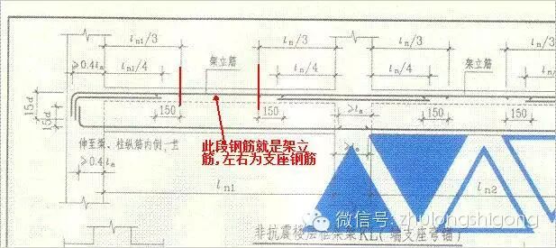 架立筋是构造要求的非受力钢筋,一般布置在梁的受压区且直径较小。当梁的支座处上部有负弯矩钢筋时,架力筋可只布置在梁上的跨中部分,两端与负弯矩钢筋搭接或焊接。搭接时也要满足搭接长度的要求并应绑扎。架力筋也有贯通的,如规范中规定在梁上部两侧的架力筋必须是贯通的,此时的架力筋在支座处也可承担一部份负弯矩。
