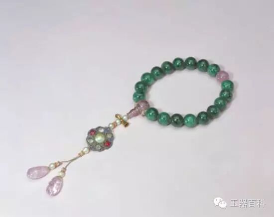 翠十八子手串,由翠珠十八颗组成,又用一枚碧玺作为结珠,又有碧玺佛头和佛头塔,下边系着金杵和金累丝嵌珠的背云,用两颗滴珠式的碧玺作坠角。