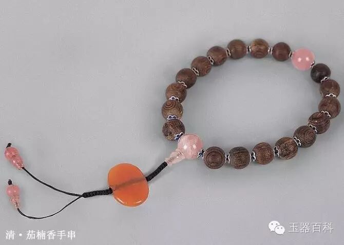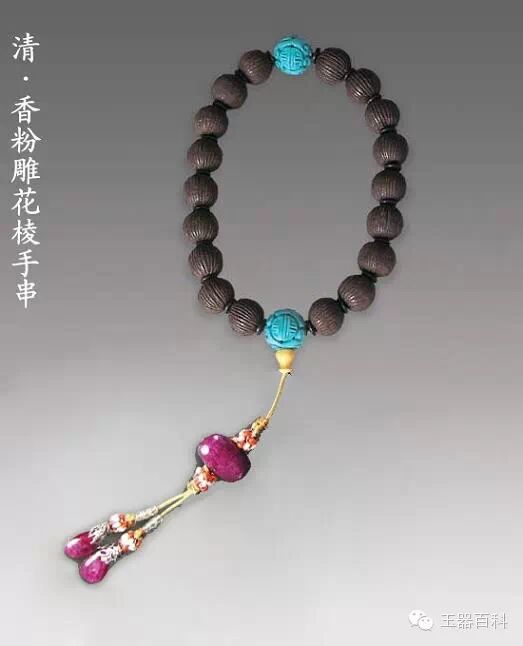 文康的《儿女英雄传》第十五回形容邓九公新娶的姨奶奶好一番打扮,道是“胸坎儿上带着一挂茄楠香的十八罗汉香珠儿,又是一挂早桂香的香牌子,又是一挂紫金锭的葫芦儿,又是一挂肉桂香的手串儿,又是一个苏绣的香荷包,又是一挂川椒香荔枝,余外还用线络子络着一瓶儿东洋玫瑰油。这都是邓九公走遍各省给她带来的,这里头还加杂着一副镂金三色儿一面檀香怀镜儿,都交代在那一个二纽上”。这里特别用了揶揄的口吻自不必说,一应琐碎却描写得真切,“都交代在那一个二纽上”,大襟的第二颗纽扣上挂手串,晚清图像上也有不少例子,如慈禧太后的许多写真画像上便有这种情形,据传闻,当时清宫造办处下设的42个工坊,就有不少是为了打造老佛爷的专属饰品而特别设立的。