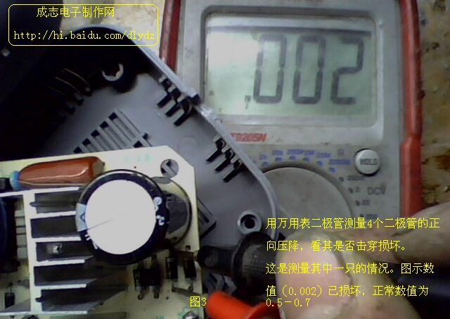 所以我们先进行第一步,检查整流二极管,用测量二极管档去测它们的正向压降,如图2,图3所示