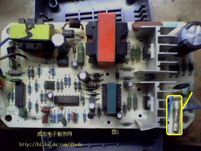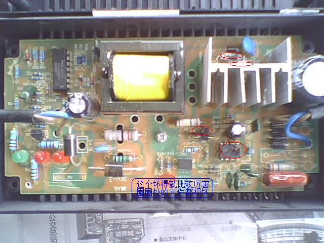 修一充电器,我们首先用眼睛观察比较明显的损坏,如上图保险丝严重烧毁,电容鼓起。还有最下一图圈红圈处(另一充电器)。然后看北面是否有元件松动脱焊,特别是变压器,滤波电感,大电解电容.