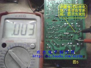 测场效应管驱动电阻是否损坏,如图6:(图示颜色为红红黑金,阻值为22欧+—5%)