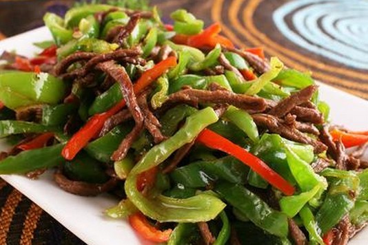 材料:肉丝(超市可以买到切好的),大青椒两个
