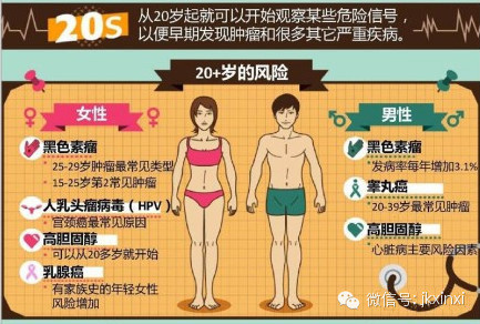 从20岁开始,就进入了健康养护的关注阶段,其中生殖系统、黑色素瘤方面病症值得我们关注。
