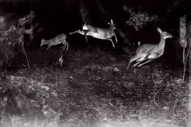 闪光灯陡然一亮,鹿群惊起,四散逃入苏必利尔湖附近的树林。摄影:乔治·夏伊拉斯三世