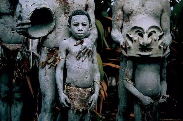 这些阿萨罗泥人(Asaro mud man)身上涂满了河泥,还戴着狰狞的面具,目的是模仿最初用这种毛骨悚然的伪装吓跑敌人的祖先。摄影:约迪·科布