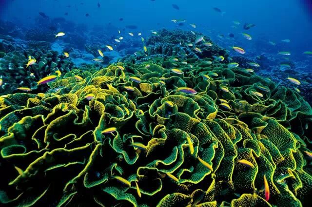 可爱的鱼(basslet fish)披着黄色和紫色的灵光穿梭在柔纹珊瑚(lettuce coral)绽放出的荧光之间。摄影:保罗·尼克伦