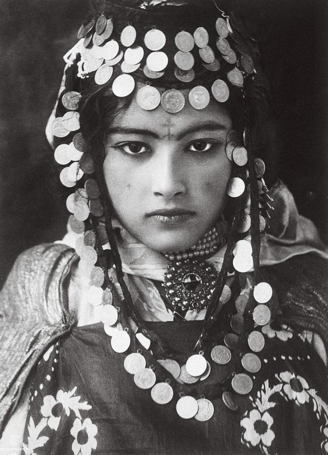 她的脸上有指甲花染的花纹,眼睛周围上了化妆墨粉,她凝视的眼神中有直白的诱惑。这个乌列奈尔(Ouled Nail)部落的女孩是众多离开阿尔及利亚(Algerian)山区,在法属北部非洲那些拥挤的咖啡馆里表演迷人的肚皮舞的姑娘之一。她们赚来的大笔收入用来买珠宝也当嫁妆,最终回到沙漠中的老家并安顿妥当后,她们开始寻觅夫婿。摄影:鲁道夫·莱纳特