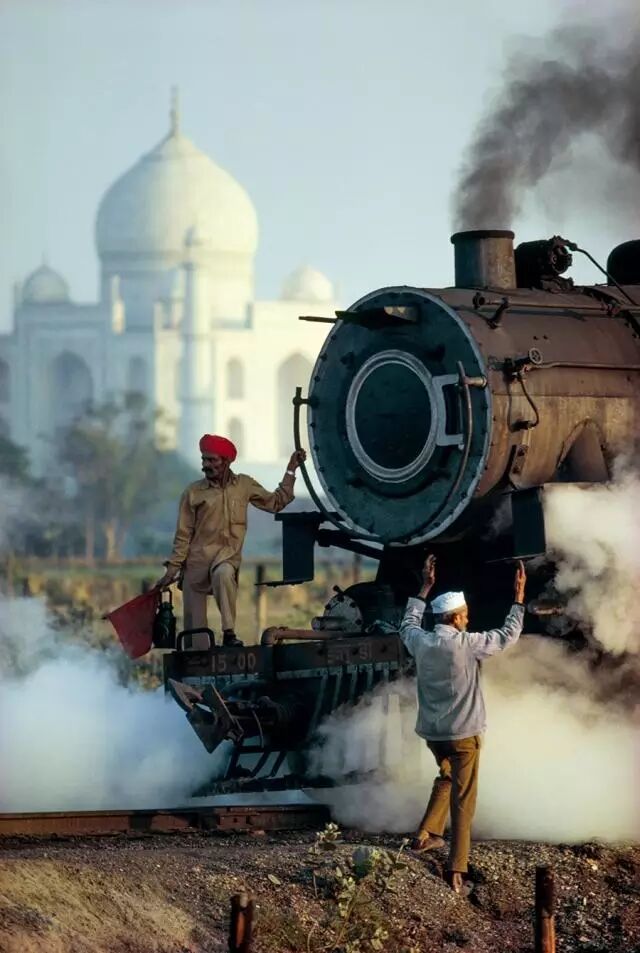 在远处闪闪发光的泰姬陵,对于一个将列车开到阿格拉堡站(Agra Fort Station)的铁路工人,已经习以为常。摄影:史蒂夫·麦凯瑞