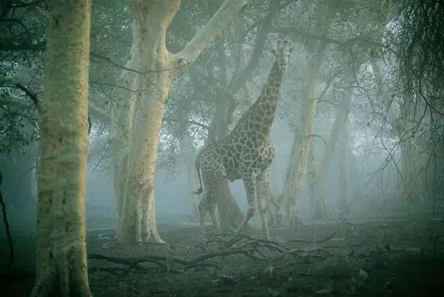 在恩杜莫野生动物保护区(Ndumo Game Reserve)深处,一头长颈鹿小心翼翼地穿过一片雾气迷蒙的“发烧树”(即金鸡纳树),这是一种生长在沼泽遍地、充满雾气、毒气弥漫地区的洋槐。摄影:克里斯·约翰斯