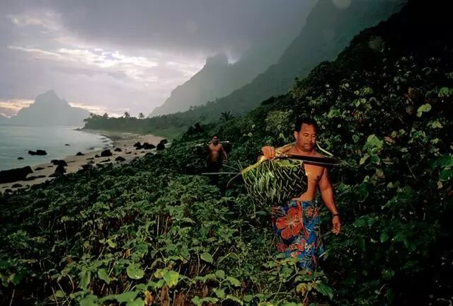 农场工扛着弯刀和装满同伴午餐的篮子从奥洛塞加岛(Olosega Island)的山坡上穿过。摄影:兰迪·奥尔森