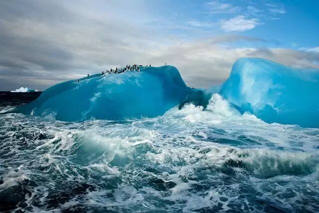 南极洲附近的圣烛节岛上的帽带企鹅停留在一块蓝色冰山顶端,以这块被侵蚀的冰山作为临时休息点。摄影:玛利亚·司坦泽