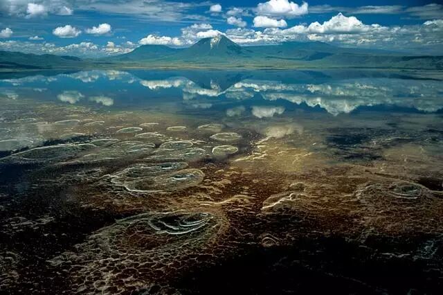 倒影在纳特隆湖清澈湖水中的云朵好似倒转了飘浮的位置,而湖底的湖床上布满了多彩的矿物沉淀物。摄影:斯图尔特·富兰克林