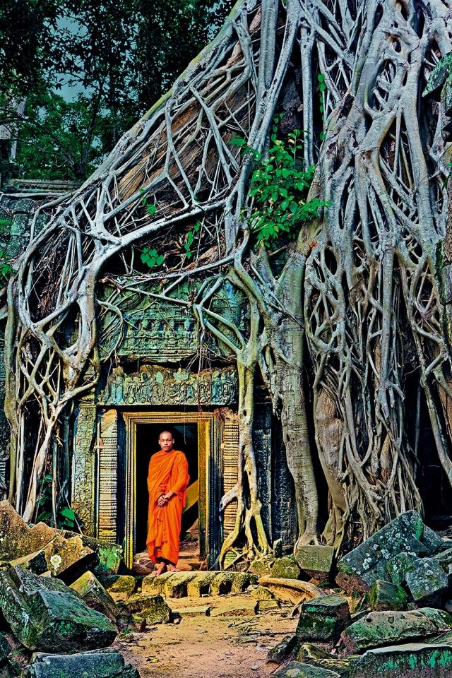 画框中呈现的是一个坚忍的和尚站在塔普伦寺(Ta Prohm)门口,这个寺庙是柬埔寨吴哥地区众多被毁坏的寺庙之一。摄影:罗伯特·克拉克