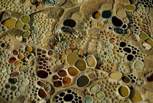 用来蒸发盐水的水洼如斑点般装点着靠近特吉达附近的沙漠地面,如一块调满了柔和色彩的画板。摄影:乔治·斯坦梅茨