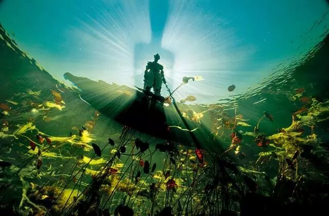 照片从鳄鱼的视角仰视,可以看见光线在充满了百合花的水中世界里弥漫开来,而一个布什曼人正往下细看奥卡万戈河的洪水。摄影:戴维·杜比莱