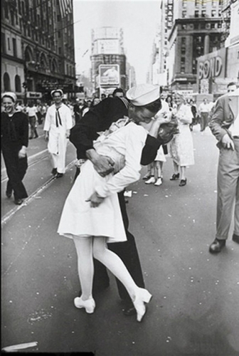 《时代广场的胜利日》当第二次世界大战结束的消息传到纽约的时代广场,一位 狂喜的美国海军士兵搂过正在身旁的陌生护士热烈地吻着她。 照片出现于《Times》杂志, 是反映战争结束后人们轻松欢乐心情的优秀作品。40年后,伊森斯塔特在报上刊登寻人启事找到了当年的这两位照片中的男女,他们已成了子孙满堂的爷爷和奶奶。