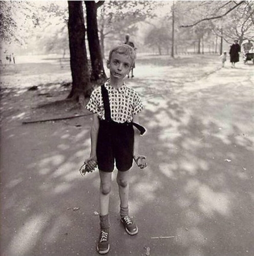 《拿手榴弹的小男孩》阿伯斯的风格是一种幻想世界和意识形态世界的不和谐。正如这幅照片中阳光明媚的公园和两棵梨树之间, 以及优美的景致和小孩子明显的恐怖而带点残暴的表情。
