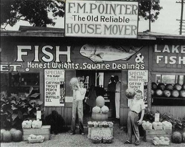 《铁路边的商店》阿拉巴马州的一个铁路边的商店,再现了美国30年代乡村富有的一面:种类繁多的瓜果和鱼,以及穿戴整齐的商店老板。不过很快的,美国经济就进入了大萧条期。这也是这张照片被人追忆的原因。