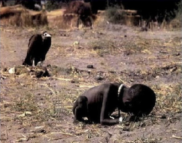 《饥饿的苏丹》这张照片是凯文卡特, 赢得1994年普利策新闻特写摄影奖的作品。那是一个苏丹女童,即将饿毙跪倒在地,而兀鹰正在女孩后方不远处,虎视眈眈,等候猎食女孩的画面。 这张震撼世人的照片,引来诸多批判与质疑。当人们纷纷打听小女孩的下落,遗憾的是,卡特也不知道。他以新闻专业者的角色,在按下快门后赶走了那只兀鹰,给了小女孩一些食物和水,最后看着小女孩离去。在他获颁这一生最高的荣誉两个月之后,卡特自杀身亡。道德良心上的遣责,可能是卡特无奈结束生命的原因之一吧? 在我们周围,正有无数这样的图像在形成、在发生,你我是否也仅止于按下人生镜头的快门,然后,漠然地擦肩而过?