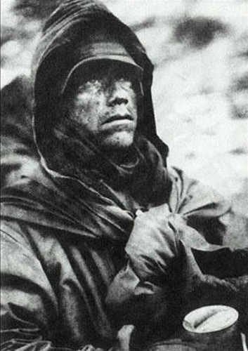 《撤退》这是在撤退中的美国的海军陆战队士兵, 邓肯别具匠心,真切的表现了当时极度的寒冷。1950年美国海军陆战队在朝鲜作战,冬季来临之前战况一直不错。当时麦克阿瑟将军的部队高估了自己的实力,以为他们会顺利推进到朝鲜北部,他们都意想不到地受到中国抗美援朝部队的回击。 史密斯将军的话使他们的失利更加出名:“Withdraw?..........!We go aheaad to the wrong drection!”