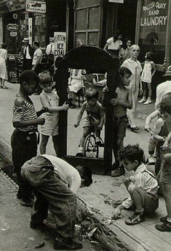 《碎镜》子打碎了, 两个孩子在拾碎片,其它的孩子则默默看着,像犯了错的大人们那样惶恐。与此同时,另外的世界则依然各自奔忙,这是1981年出版的《观察的方式》一书,68张系列街头摄影中的第14张,也是作者最得意的作品之一。