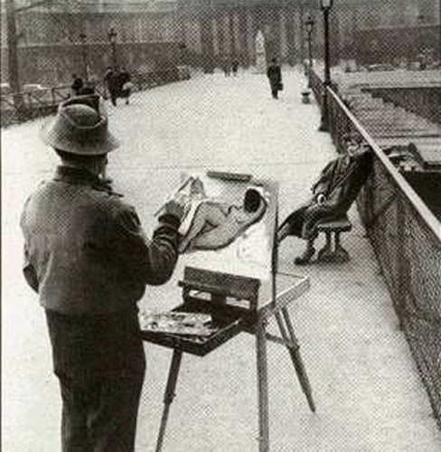 《陷阱前奏》画家为他穿著大衣的女友画一幅裸画, 这是在塞纳河畔由摄影师精心安排的一个“圈套”,最初的目的不过是想看看周围的人对此有何反应。