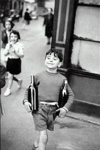 《布列松习作》这张照片的题材并不重大,但却是布列松的一幅脍炙人口的名作。表现一个男孩:两只手里,各抱一个大酒瓶,踌躇满志的走回家去,好象完成了一个光荣而艰巨的任务。照片中的人物,情绪十分自然真实。