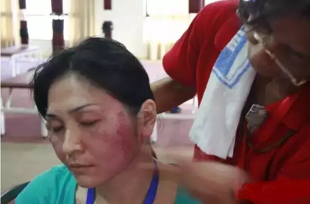一般脸不易拍出痧,但这位女士左右两边都拍出大量痧。拍脸自己一般不易下手,所以排毒出痧更方便。从出痧部位可知其三焦经、大肠经、胃经都不通。所以美容问题跟美容院没关系。从全系反射学的角度看,其五脏六腑也都有问题。