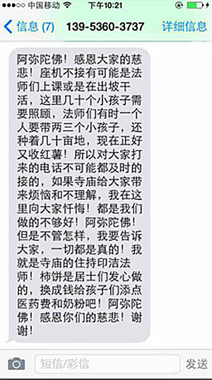以下是昨天电话无人接听,印洁法师短信回复截图: