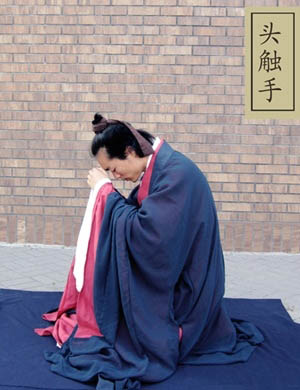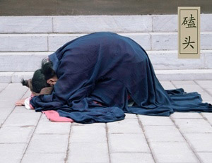 【稽首】古代的拜礼,为“九拜”之一。行礼时,施礼者屈膝跪地,左手按右手,拱手于地,头也缓缓至于地。头至地须停留一段时间,手在膝前,头在手后。这是九拜中最隆重的拜礼,常为臣子拜见君王时所用。后来,子拜父,拜天拜神,新婚夫妇拜天地父母,拜祖拜庙,拜师,拜墓等,也都用此大礼。