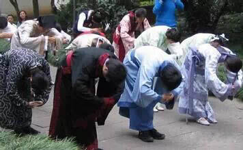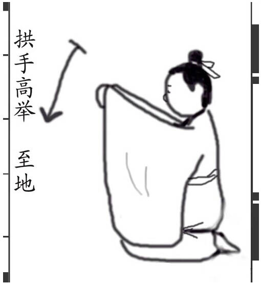 长揖:肃立,俯身,拱手高举,自上而下移至最低,俯身90度,是谓“长揖至地”