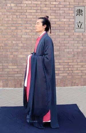 汉家礼仪,讲究端庄自然。肃立,脚程八字便可