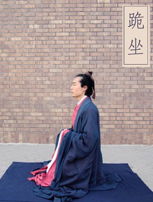 跽跪(两膝着地,上身挺直); 跽坐,正坐。脚尖立起。 常用于跪拜。 经坐脚背贴地。