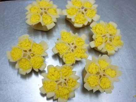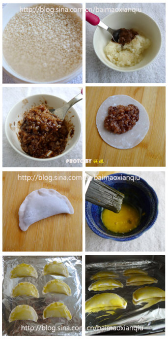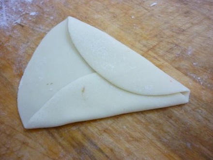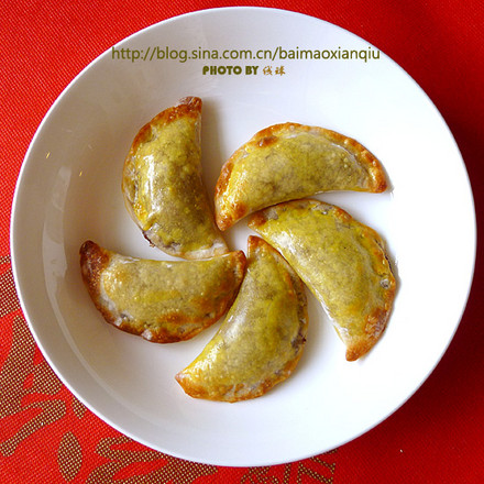 原料:面粉200克,开水100克,青菜500克,鲜香菇50克,发好木耳50克,笋50克,麻油5克,盐、鸡精、糖适量 制作方法:面粉用开水烫熟,稍微冷却一下,揉成面团 青菜用开水烫一下,和香菇、木耳、笋一起斩碎,挤干水分,加盐、鸡精、糖和麻油调好口味 把面团搓条,下剂子擀皮,包入馅心。把圆皮均分5点,粘在一起形成5条边,把口捏紧 用拇指和食指捏出花边,形成5个叶片。把叶片底部向上拉起和相邻的叶子在中间相粘 把做好的青菜蒸饺放入蒸笼大火蒸6分钟左右即可 四、翅膀蒸饺 这是一道比较简单易学的花色蒸饺。馅心可以自己选择,甜的,咸的,荤的,素的都可以。今天我用的是素菜馅。原料:面粉200克,开水100克,青菜500克,木耳50克,鲜香菇50克,笋50克,麻油5克,盐、糖、鸡精适量 制作方法:青菜洗净入开水锅烫一下,和洗净的木耳、香菇、笋一起切碎,挤去多余水分,加盐、鸡精、糖和麻油调好口味 面粉用开水冲烫揉成面团【做蒸饺的面团一般都用开水和面,这样面团筋度减小,可塑性强,利于造型】。下剂子,擀成圆皮 包入菜馅,捏成月牙饺 用拇指和食指捏出花边 两边向后捏,捏出一对翅膀 放入蒸笼蒸熟即可 五、鸳鸯蒸饺(亲手为Ta包一份浪漫) 说起这鸳鸯饺,也是中国饺子文化中的一个不可为之叹赏的亮点。它色彩鲜艳,造型美观,质软滑嫩,滋味鲜美,还可同时吃出不同味道 ①面粉开窝,分次加水和至软硬适中的面团,醒置20分钟。 ②芹菜焯水至七成熟,切末备用;肉末加料酒和胡椒粉腌制半小时,炒熟后和芹菜末拌匀;加盐,鸡精味精调味即可。 ③面团搓条,下剂,擀皮,包馅。皮要薄。 ④下面是图解步骤,一定要看仔细。 ⑤上面就是详细的包制手法,然后上锅蒸10分钟,出锅后点缀即可!记住颜色对比要鲜明而且不冲突啊~ 六、黄金月牙饺(恭喜发财) 材料:饺子皮15张、圆粒糯米50克、榛仁巧克力酱2勺、鸡蛋黄1个 步 骤: 4、取适量糯米巧克力酱馅料放入饺子皮中,折成月牙状,紧实捏合起来,顺序放入烤盘中,每只上方均匀刷上蛋液,将烤盘放入预热的烤箱中; |