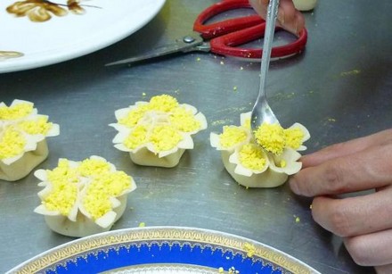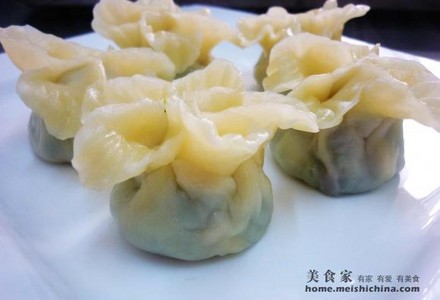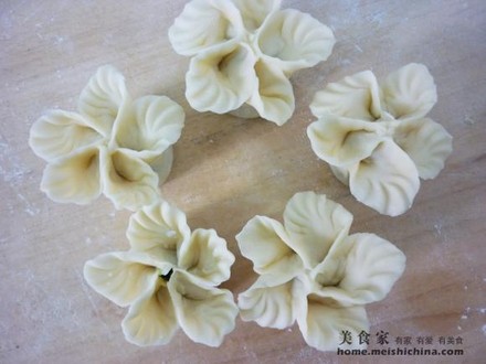 最新的饺子包法,不会你就OUT了! 每天分享更多育儿营养健康知识乐乐妈妈交流QQ:396574584 这些最新的饺子包法,看了图文你会觉得很简单,无论大家在国内还是海外,都转起来、学起来吧,绝对值得! 一、蝴蝶蒸饺(学会你就帅呆了!) 原料:面粉200克,开水100克,肉馅150克 制作方法:面粉用开水烫成面团,揉光揉匀。下剂子,擀成圆皮。 如图所示将面皮的两边卷上来,留下小半边不卷。 把面皮翻过来,放入馅心。 将馅心包起来,把两条直边捏起来。 没翻卷的面皮做成眼睛 捏出翅膀的花纹 把两只翅膀翻过来 做好的蒸饺蒸熟 二、牡丹蒸饺(太拉风了) 原料:面粉200克,开水100克,肉馅150克,熟蛋黄4个 制作方法:面粉加入开水烫成面团,揉光搓条下剂子,擀成圆皮 放入馅心 均分五点向中心捏在一起,形成如图所示的形状 把相邻的两边再相粘结 在每片花瓣上剪两刀,就形成了牡丹花的花瓣 把熟蛋黄碾碎,放入花瓣中作点缀 做好的蒸饺放入蒸笼蒸熟 放入用酱汁画好图案的盘中