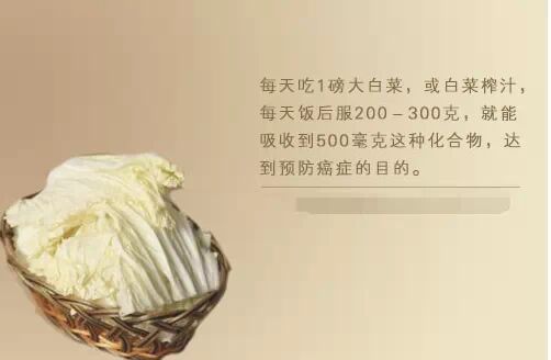 另外大白菜所含有的微量元素钼,钼——是人体金属酶的重要组成部分,据调查在食道癌的高发地区,人们头发当中钼的含量最低,这与当地水土中缺钼是有关的。能够防止致癌物亚硝铵合成的微量元素钼大量存在于大白菜中,能阻断亚硝胺等致癌物质在人体内的生成,所以能防止癌症的发生。据测算,每天吃1磅大白菜,或白菜榨汁,每天饭后服200-300克,就能吸收到500毫克这种化合物,达到预防癌症的目的。