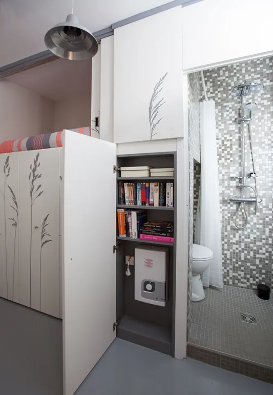 厨房,卫生间,床,衣柜,书架都有,真是麻雀虽小,五脏俱全。 看起来非常简单素雅,住在这样一个公寓里,虽小但也别有一番风味 。