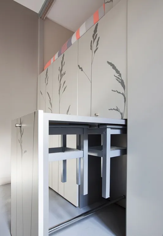 可以把桌子椅子收起来放在柜子里,要用的时候就把它们拿出来,不用的时候就把它们推进去。